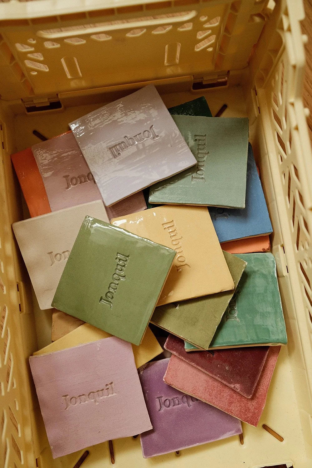 Les créations, minutieusement fabriquées en faïence dans leur atelier, sont cuites une première fois à 1000°, puis émaillées et recuites une seconde fois à plus haute température. Ce procédé leur permet d’obtenir une palette de couleurs à la fois vive et délicate.